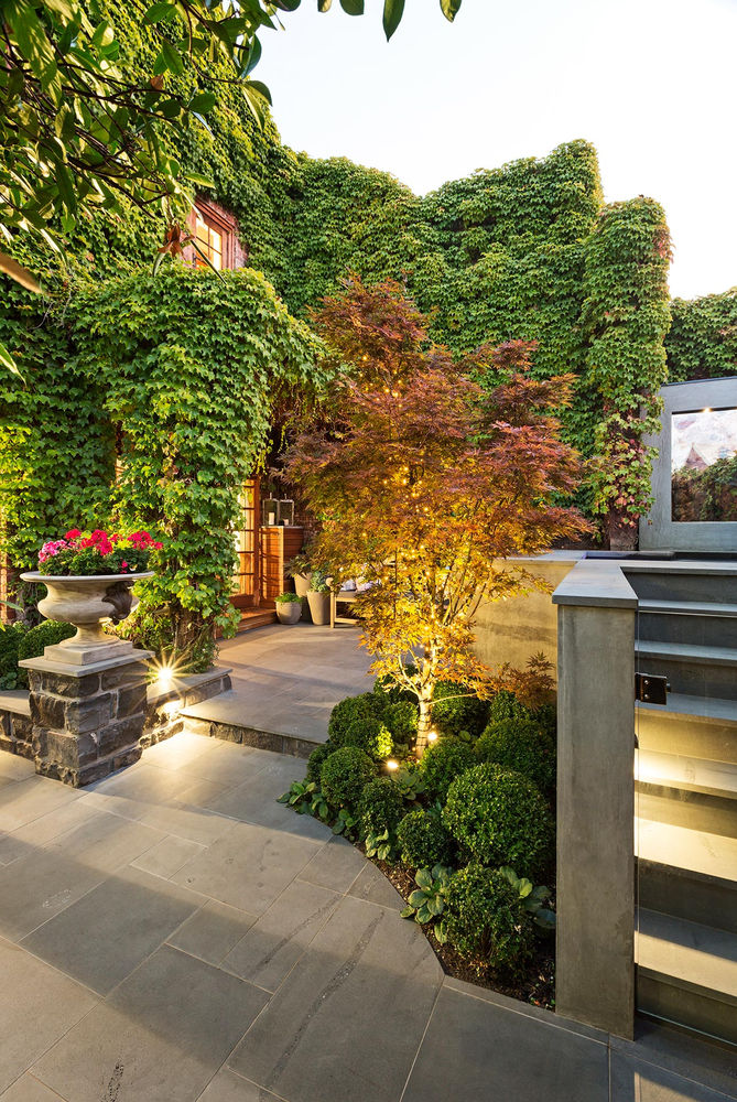 The paving offsets the rich greens of the planting palette, which includes multiple buxus balls that create a softening “cloud” effect, feature plantings of Japanese maples and succulents in pots. At night, the plants, as well as the key design elements, are illuminated by Aqualux lighting and there is an outdoor sound system to set the desired mood.
