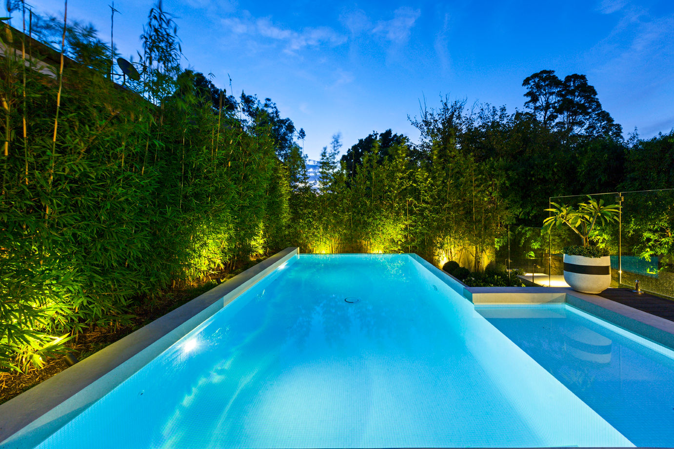 Lighting was another important design element and included pool fighting and uplighting of the infinity edge to give the area a mesmerising ambience. Also incorporated was a selection of garden and hedge lighting to highlight the luscious greenery throughout the garden.